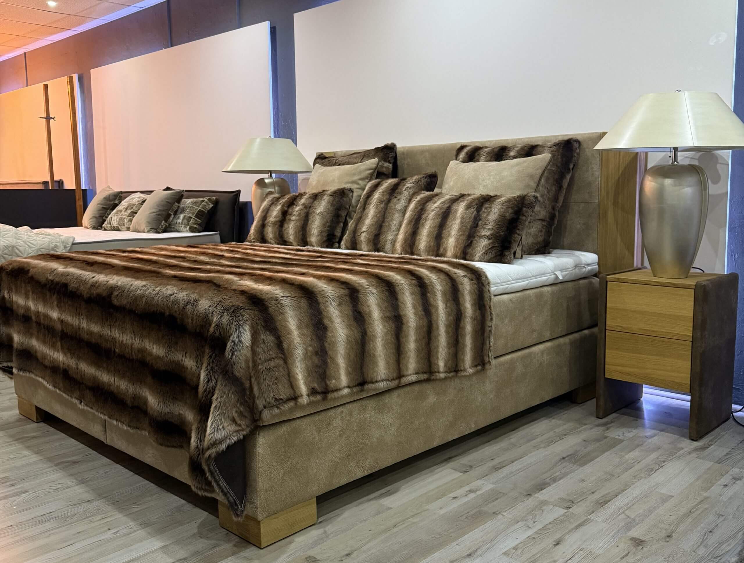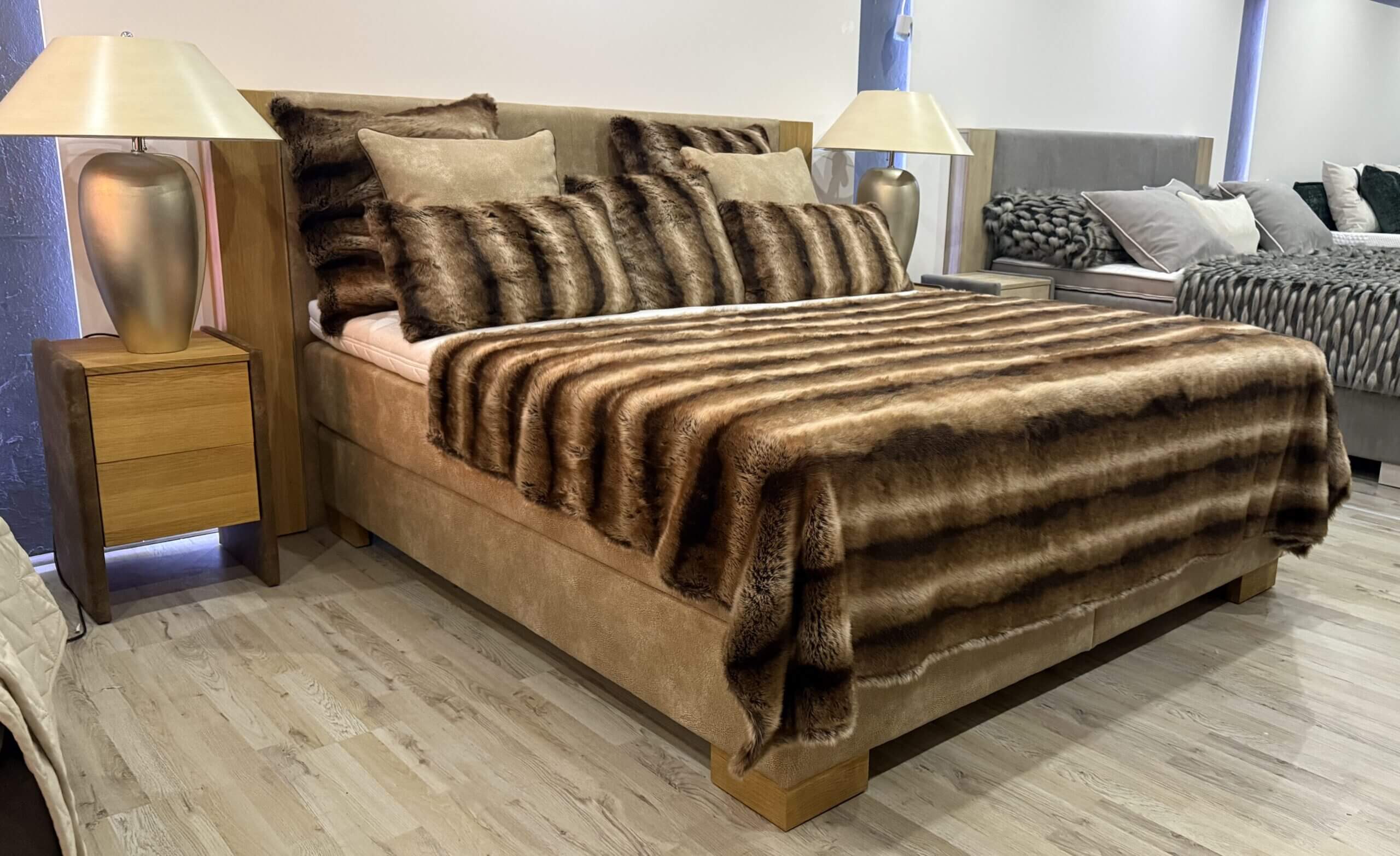 Exclusives Boxspringbett im skandinawischen Baustiel mit Eiche massiv Applikationen.