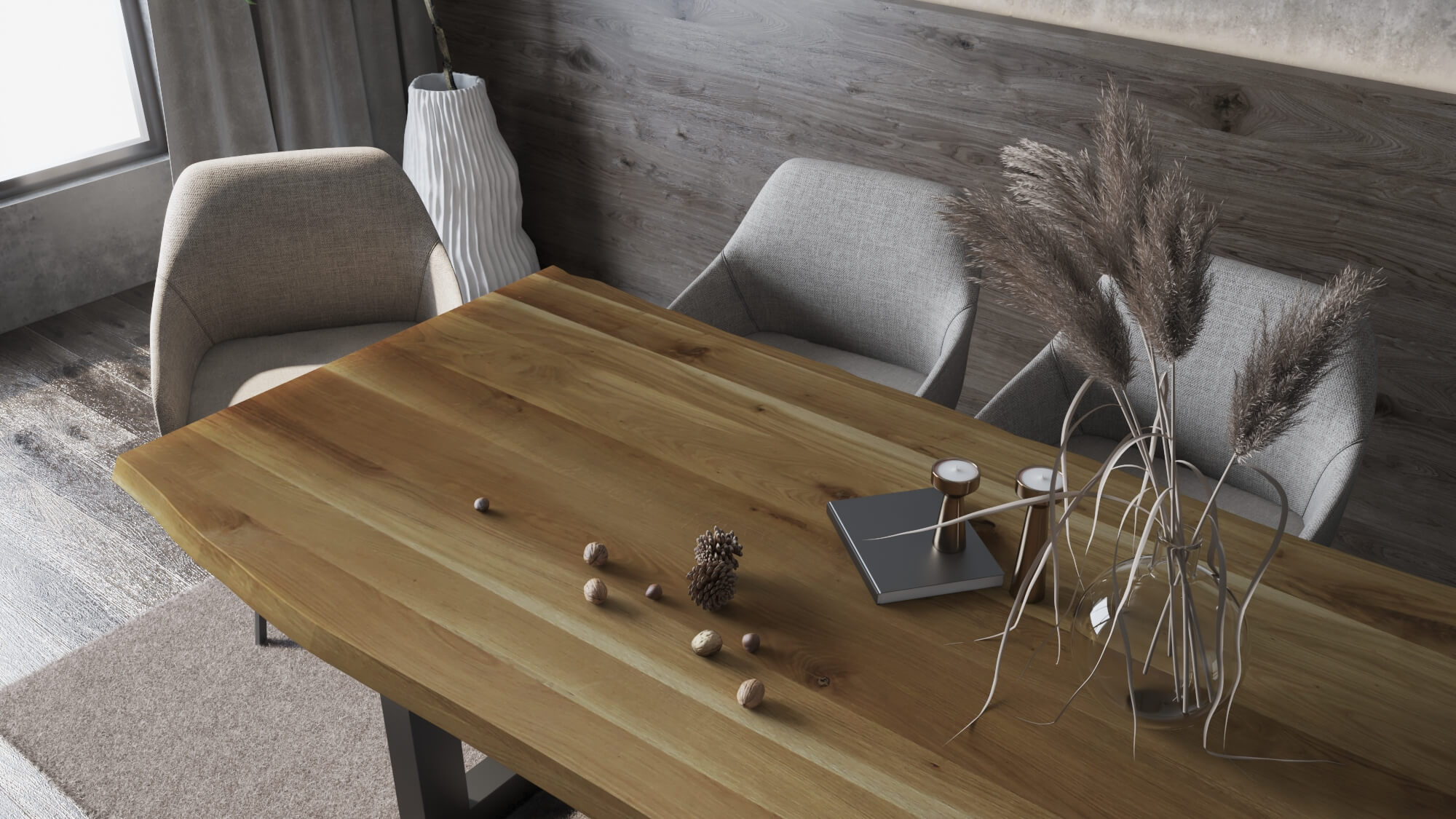 Unser Baumkantentisch bringt die Schönheit der Natur direkt in Ihr Zuhause – kraftvoll, lebendig und einzigartig in seiner Form. Die charakteristische Baumkante verleiht jedem Tisch einen individuellen, organischen Look.